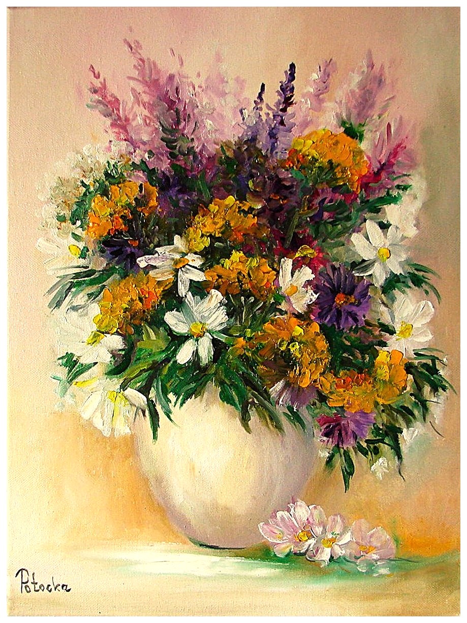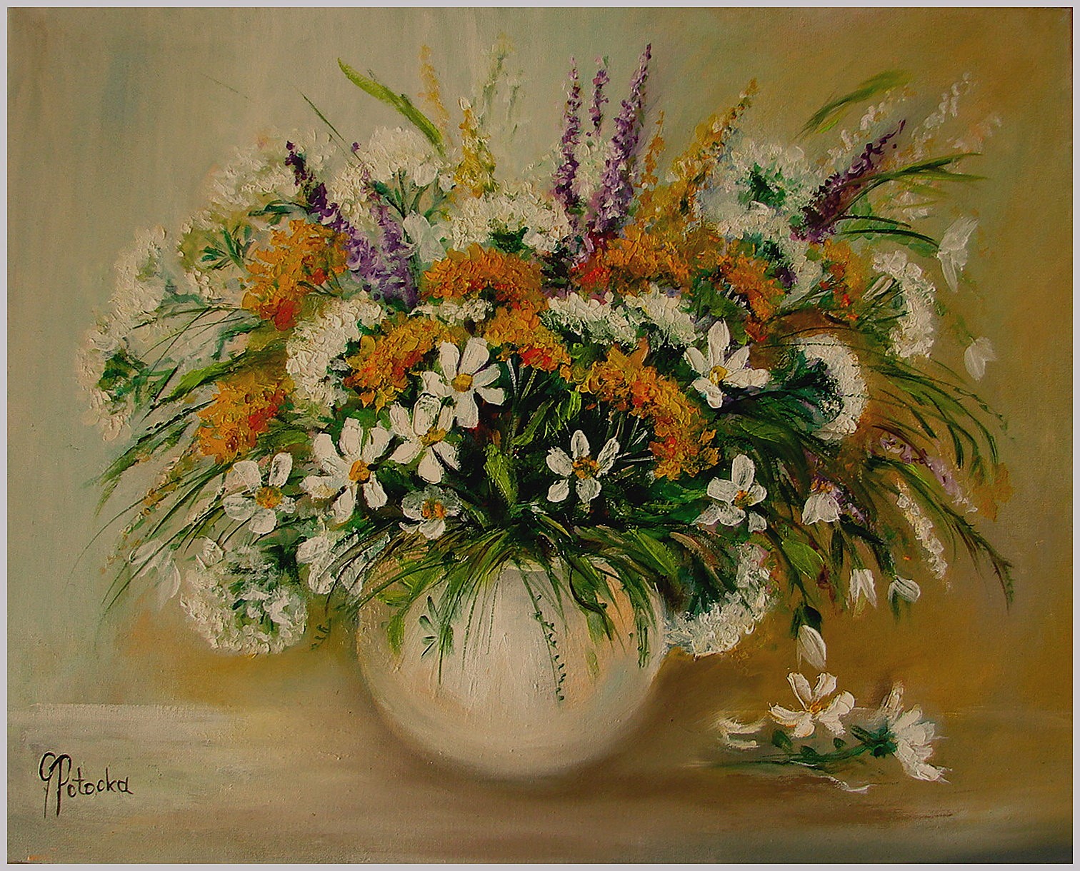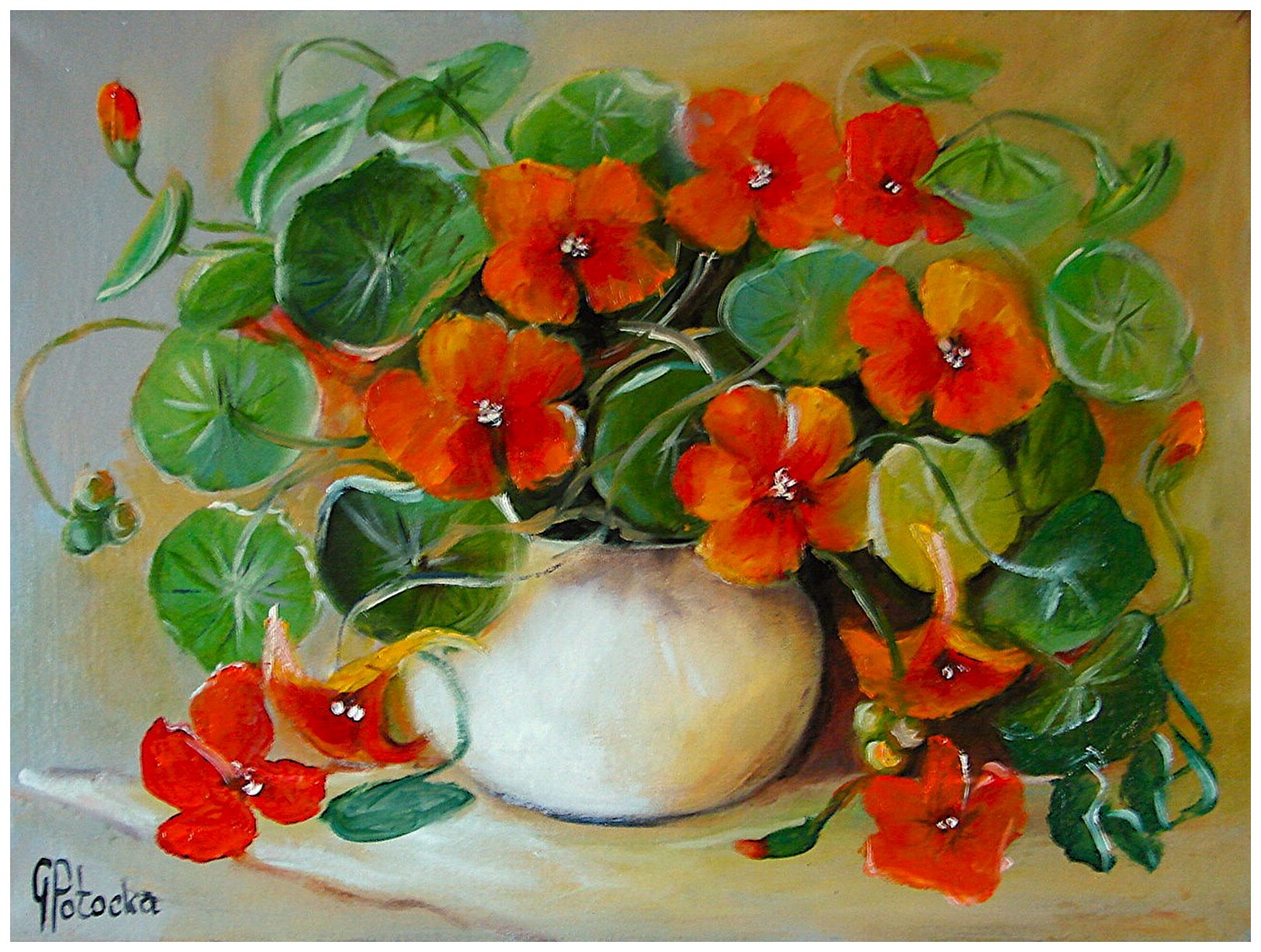 Maluję farbami olejnymi na płótnie, martwe natury, kwiaty oraz polskie pejzaże.